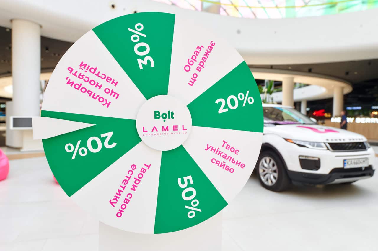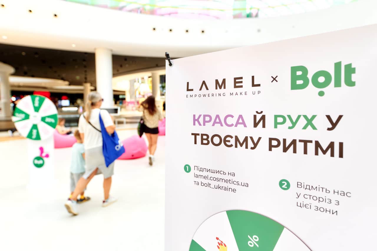 - Pop-up зона в Respublika Mall. 16 августа Bolt и Lamel провели яркий pop-up в киевском Respublika Mall. Гостей ждали фотозона, подарочные наборы косметики, бесплатный макияж и розыгрыши. На локации был представлен брендированный белый автомобиль, а посетители могли получить специальные промокоды Bolt для следующих поездок.