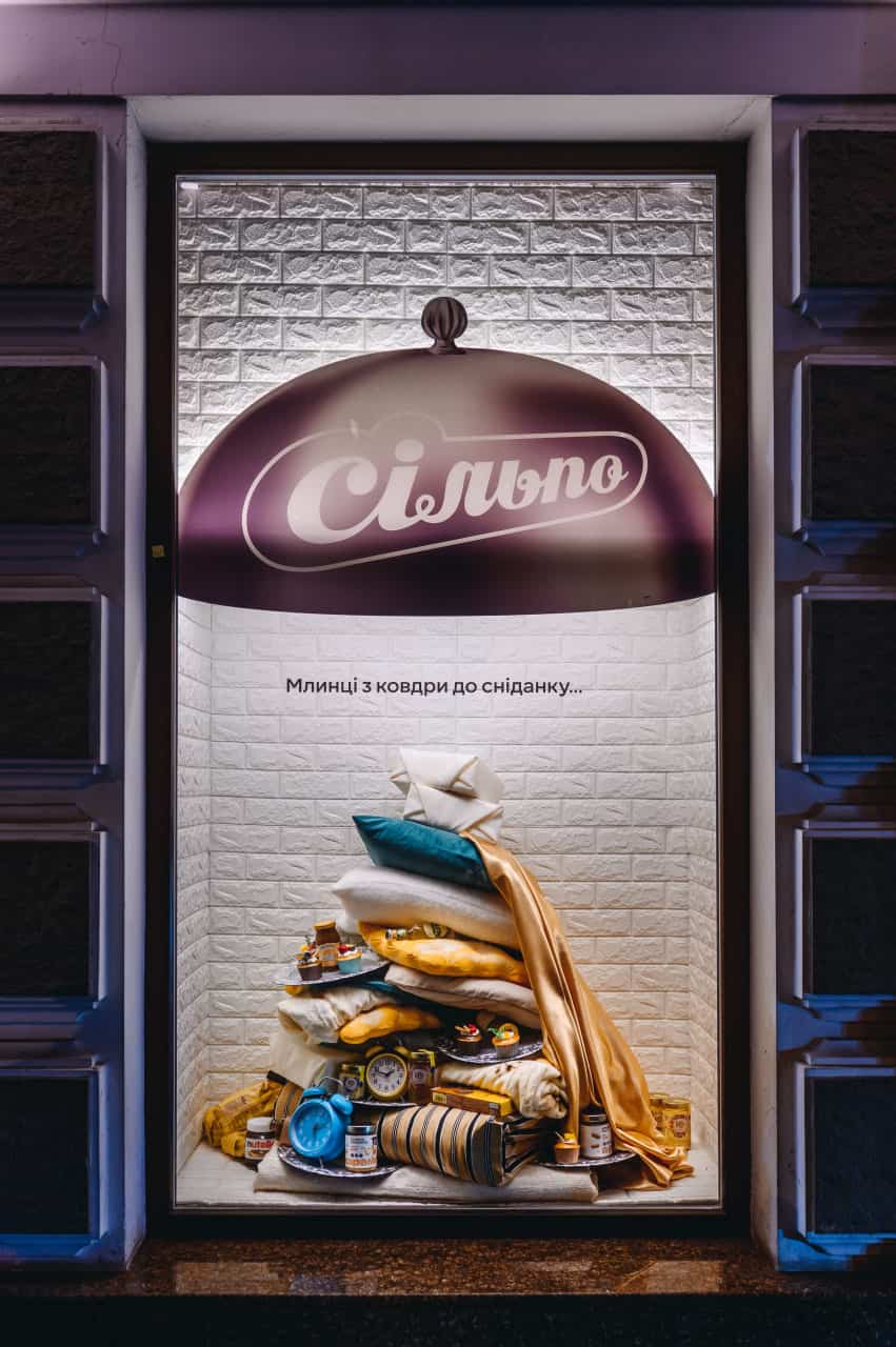 В Днепре витрины «Сильпо» также напоминают о романтике неспешного утра. Здесь уют создают множество одеял и подушек. А идеи вкусных завтраков витают в облачках или просто лежат на подушках, как на подносах. Рядом расположено сердце-зеркало с надписью, где гости могут сделать фото с намеком для любимых.