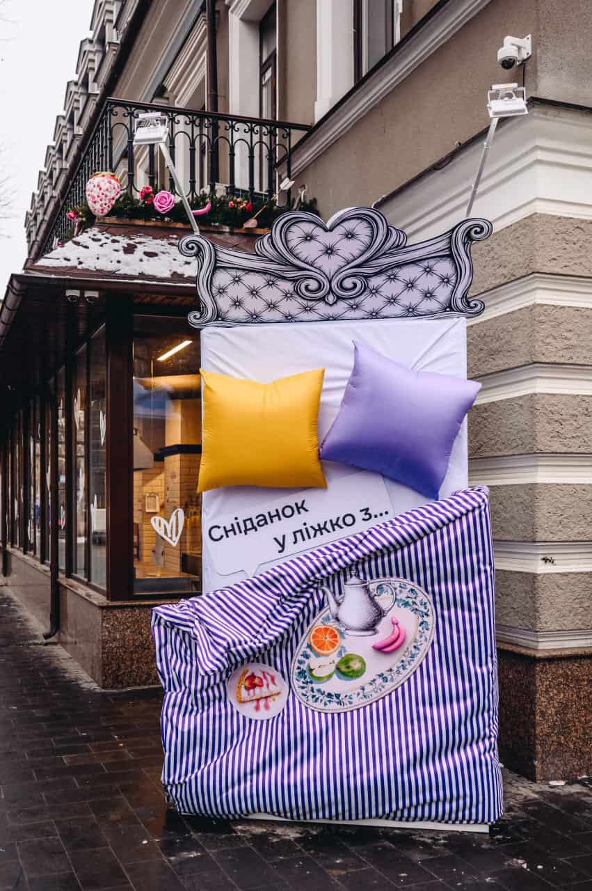 В Одессе на фасаде магазина появилась большая кровать с завтраком для фото. А в витринах можно подсмотреть идеи для романтических завтраков, хоть и несколько необычных. Здесь и любимый завтрак из полотенец, и десерт для любимых, и сладкая пончик из подушек. Такие детали с легким одесским юмором напоминают, что свидание может быть простым и домашним, но при этом не менее романтичным.