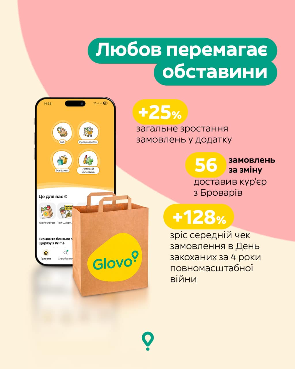 За четыре года полномасштабной войны средняя сумма «романтического» чека выросла на 128%. Эти цифры подтверждают важную вещь: мы научились не откладывать жизнь на потом. Для Glovo важно быть тем надежным связующим звеном, которое помогает вовремя доставлять внимание и заботу. Ведь сейчас каждый желтый рюкзак — это прежде всего возможность напомнить любимым, что расстояние или обстоятельства не имеют значения, когда мы выбираем быть рядом.