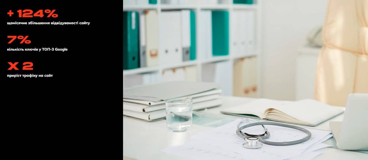 Особливу увагу приділили підготовці якісного контенту — з урахуванням принципів E-E-A-T, — оскільки для медичних сайтів Google висуває найвищі стандарти оцінки. До створення текстів залучили лікарів медичного центру, що дозволило забезпечити унікальну експертну подачу. Паралельно усунули внутрішню канібалізацію сторінок, оптимізували навігацію, сформували тематичні кластери та забезпечили логічну перелінковку між контентом інформаційного та комерційного типу. У результаті сайт отримав зростання органічного трафіку у 2 рази за пів року роботи над проєктом.